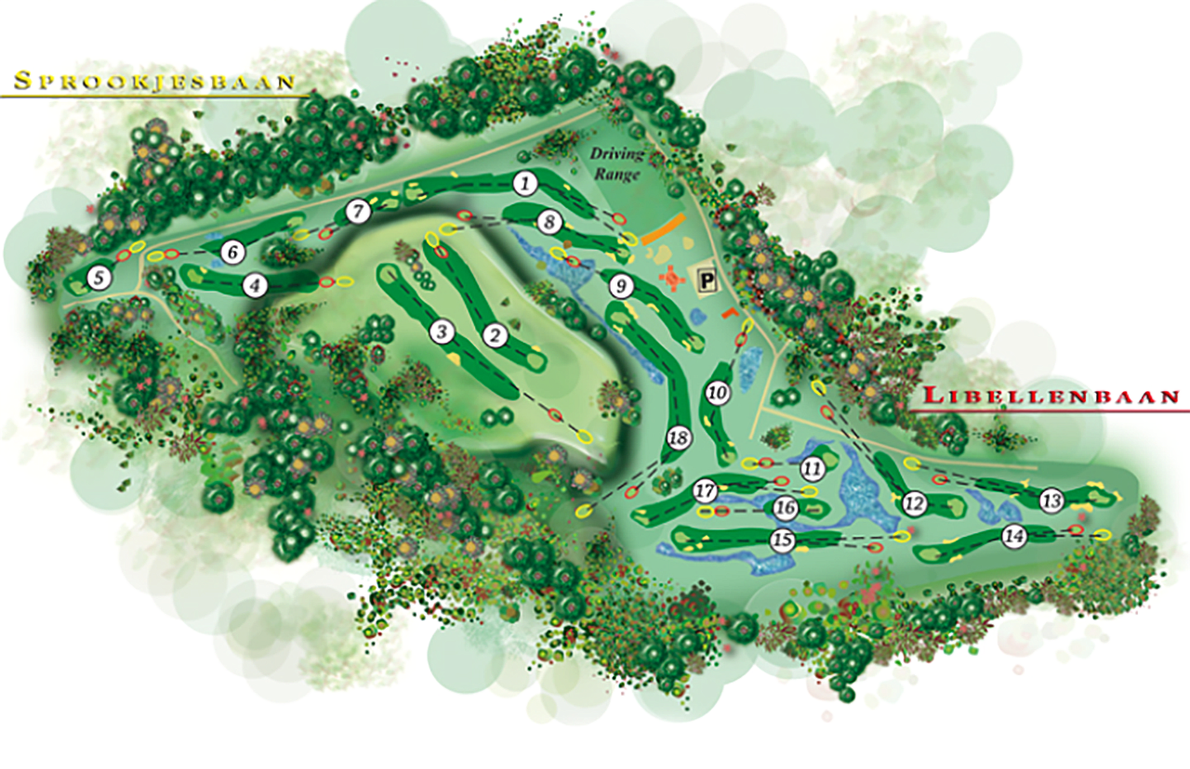 Golf De Gulbergen beschikt over een 18 holes baan welke wordt gevormd door de Sprookjesbaan en de Libellenbaan.