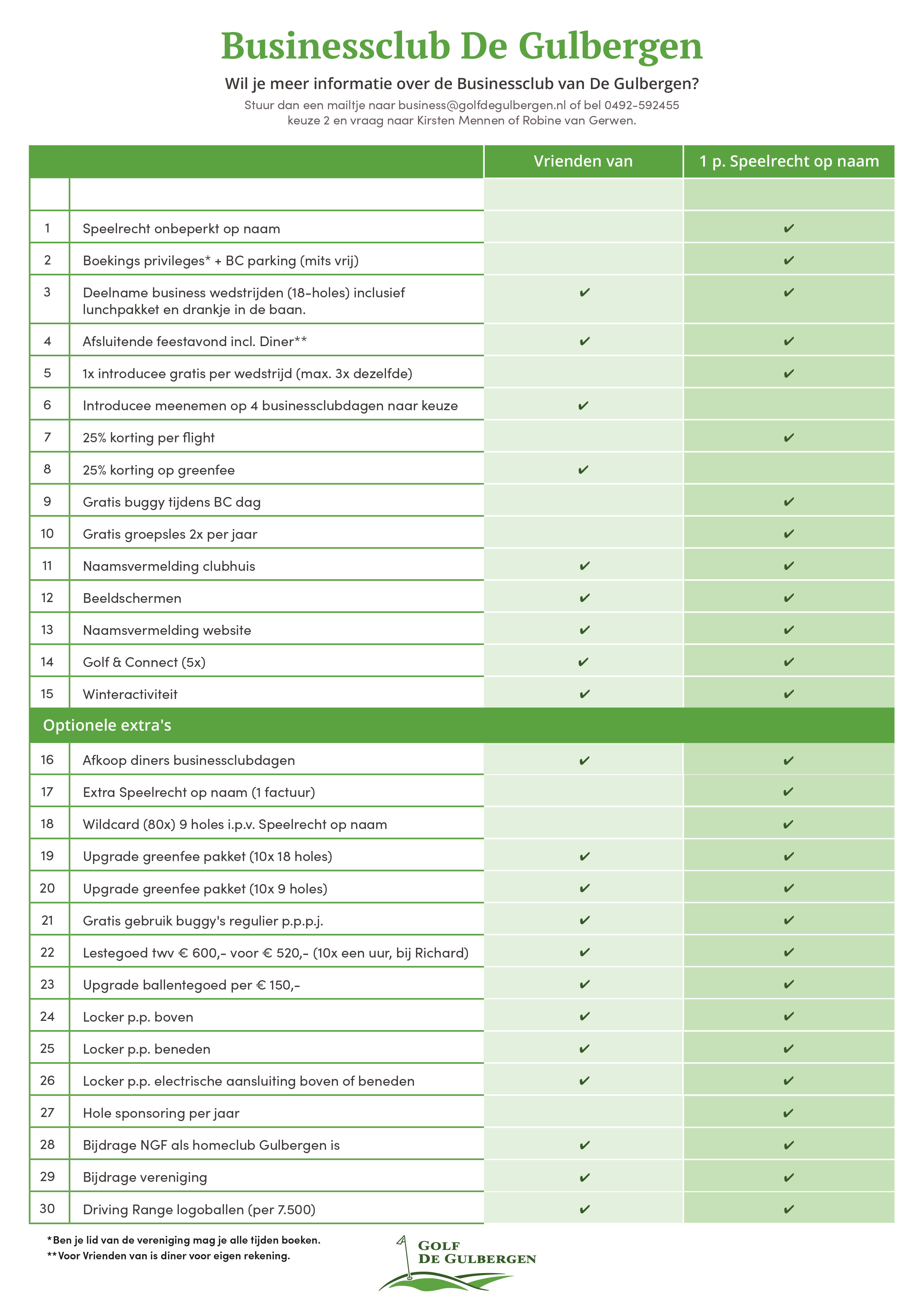 Bij Golf De Gulbergen heb je verschillende opties voor zakelijke voordelen. In onderstaande afbeelding vind je zowel de voordelen van Businessclub lid zijn, maar ook wanneer je "Vrienden van" bent van Golf De Gulbergen.